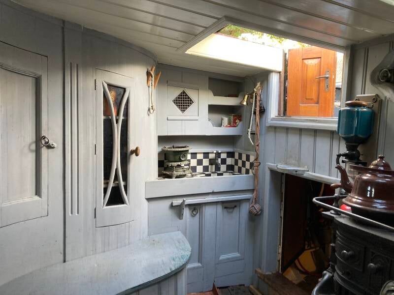 Onder het achterdek is het paviljoen. Dit was in het verleden de woning van het schippersgezin. Het schip had toen nog geen motor, dus waarschijnlijk zat de 'kooi' onder het tussendek en was het iets ruimer beneden. In deze ruimte verbleef een heel gezin: er werd gekookt, gewassen, gegeten en geslapen.
